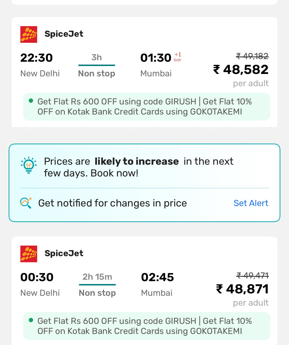 फोटो में दिख रही बुकिंग स्क्रीन के मुताबिक, स्पाइसजेट ने दिल्ली-मुंबई रूट पर फ्लाइट ऑफर तो की हैं, लेकिन किराए सामान्य से कई गुना ज्यादा हैं